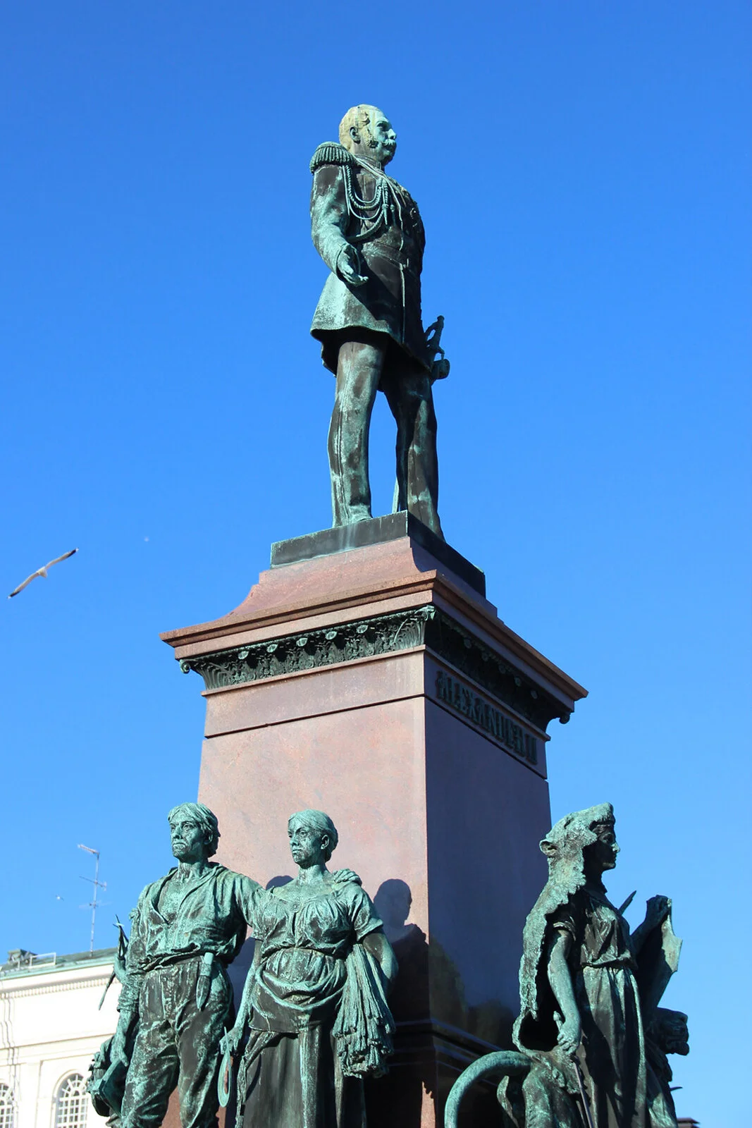 Today, monuments and symbols of the Russian period are still dotted across Helsinki. In the middle of the Senate Square in front of the cathedral, stands a bronze statue of the "Good Tsar,” Alexander II's popularity in Finland persisted during the gradual ramp-up of Russification during the subsequent reign of Alexander III and Nicholas II. Interestingly, it was said that Finns left the flower at the foot of the monument as a protest against Nicholas II's conservative cultural policies. Just a block away is another obelisk monument in the middle of Central Market Square. The golden double-headed eagle of Russia highlights Finland's close historical tie with its tsars.