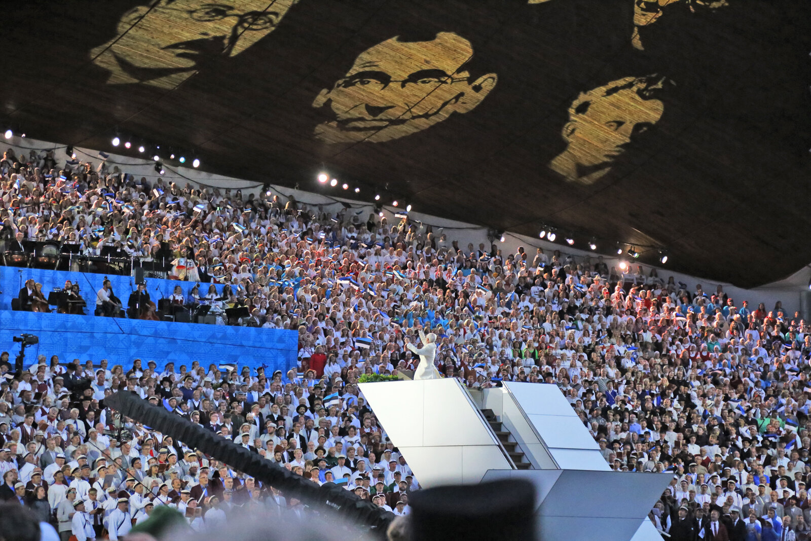 This opening concert was entitled To Our Teacher (Õpetajale). The program repertoire paid tribute to all the previous music teachers and conductors. Per customary programming, the opening concert tends to be far more cerebral and academic in nature. Although I have listened to countless hours of songs from previous festivals, I can’t say I could recognize a single song from the concert's first half. Ranging from operatic aria to performance by the Estonian National Symphony Orchestra, this portion of the program focused on the works of composers born in the late 19th and early 20th century. As a result, the music seemed more classical and lacked the popular beats from the rock period. With very few exceptions like Ester Mägi and Arvo Pärt, most composers on the program have long passed on. At the beginning of each piece, the composer's image was projected onto the Song Arch's ceiling. At first, it was not apparent because of the bright evening sky. I noticed the projected images only a few songs into the program. Note before long, it has become a collage of faces.