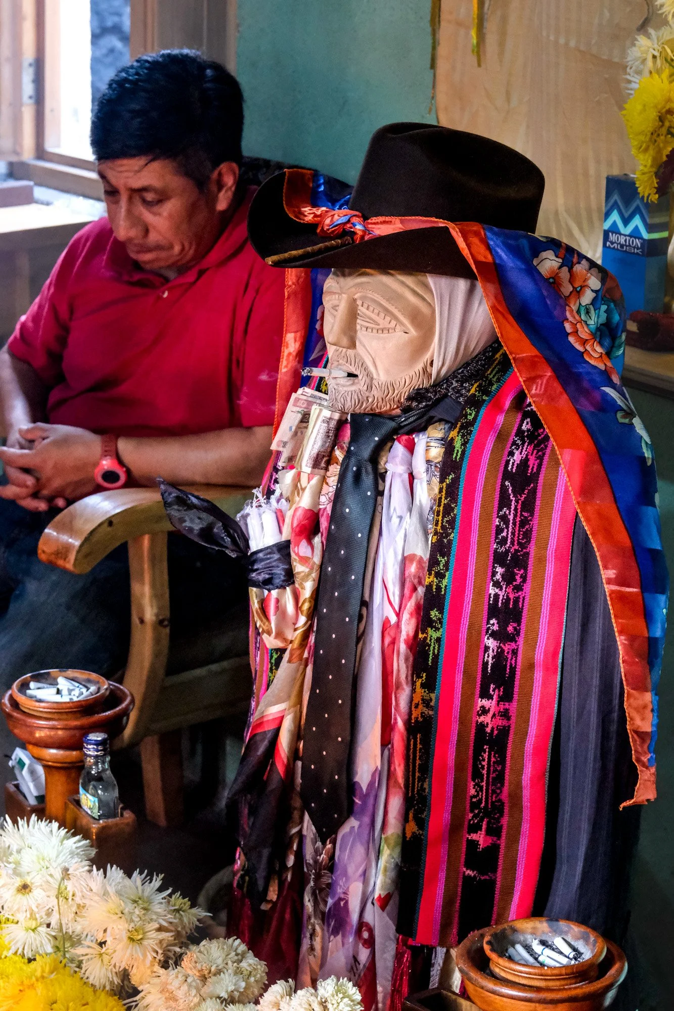 Maximón’s status as a saint is a complicated matter. He is a product of folk Catholicism, a synthesis of Catholicism and indigenous mythology. The modern manifestation is thought to embody traits of various historical characters, ranging from Saint Peter, Judas, and Pedro de Alvarado, the first colonial governor of Guatemala. The prevailing persona of Maximón was his mischievous nature. Perhaps because of the legend of sleeping with women, he is known as a saint who embraces common vices, such as alcohol, tobacco, and money. Many attribute his popularity to his dark side because he is regarded as accepting of people of all backgrounds and social statuses. People come to him from far and wide to pray to him and have their wishes granted.