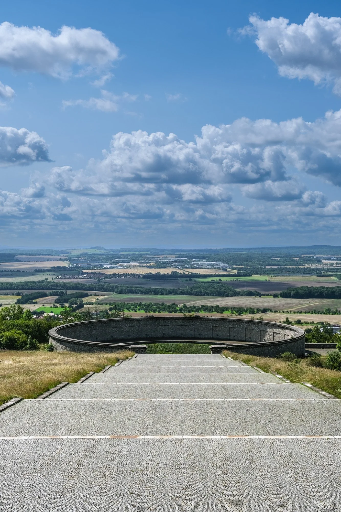The complex is set up as a one-way loop. The first section is a pathway that is lined with seven massive steles, one for each year of the camp’s existence. Each stele features a sculptural relief and text recounting the camp's history, from its construction to its liberation. The path eventually led to the first mass grave, which was ringed by a circular wall.