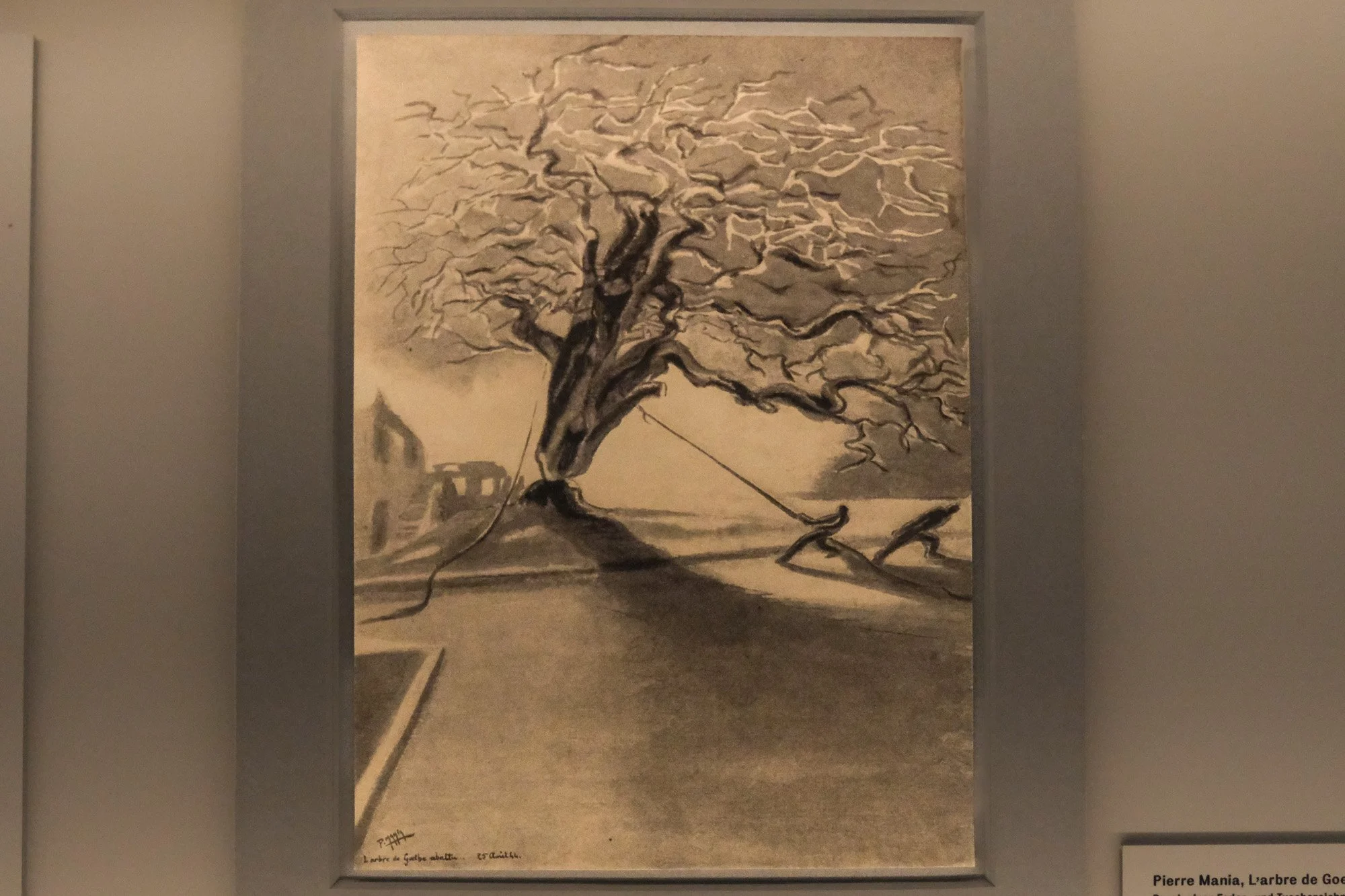 Cynically, the Nazis hanged many prisoners from the oak’s branches. As the camp developed, the Goethe Oak’s condition deteriorated due to disturbance from building activities. By 1944, the tree had lost all its leaves. Many inmates considered it a symbolic death of the Enlightenment or the impending end to the Nazi tyranny. The oak met its end when it was engulfed during an American air raid, and no inmate attempted to save it. When the oak was eventually cut down by the guards, many inmates gathered scraps as memorabilia, many of which was ehibited in the camp. German communist Bruno Apitz famously carved an image of a dying inmate in a piece of Goethe Oak during his imprisonment here.