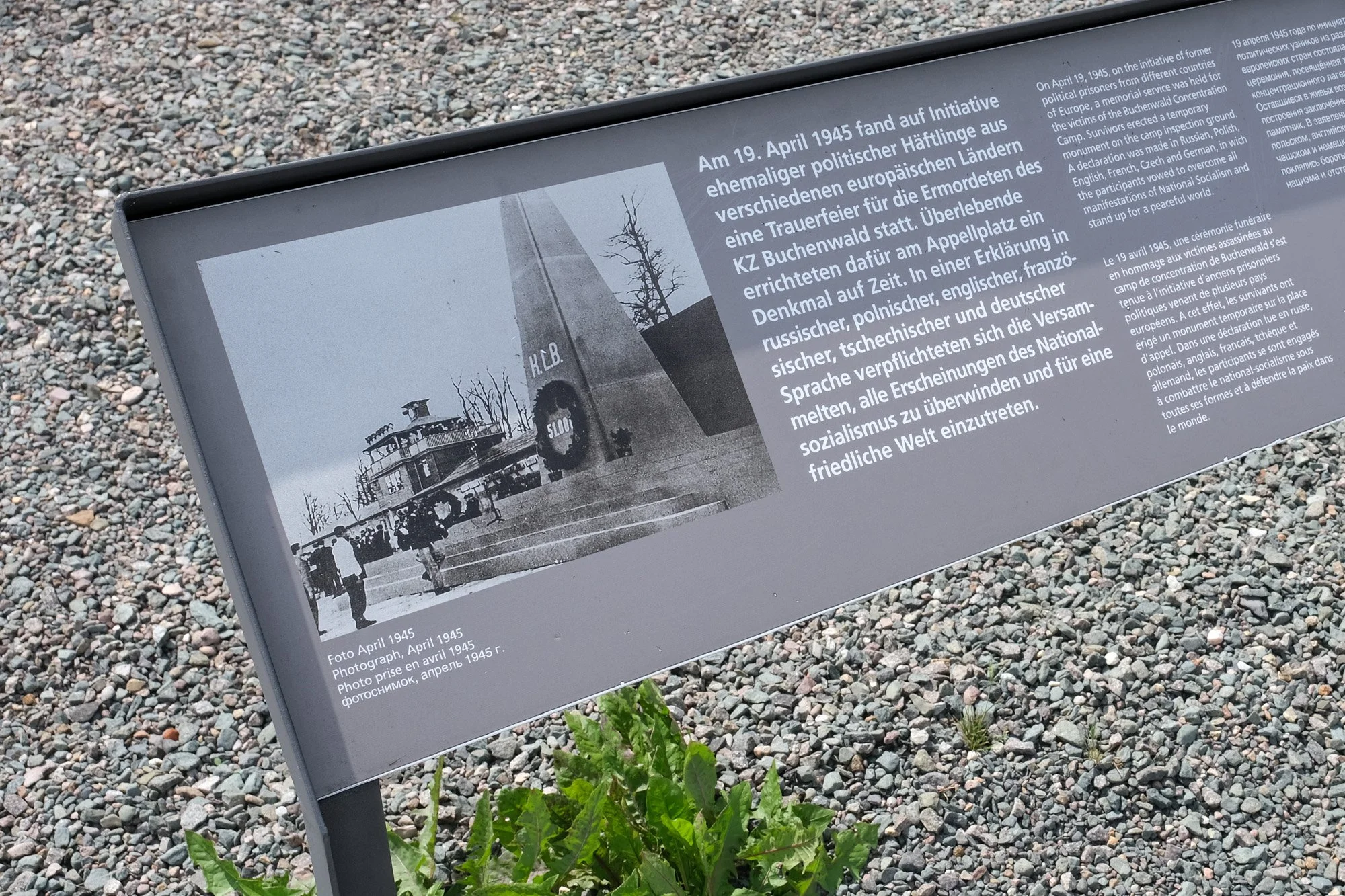 One week after the liberation, the political prisoners held a memorial service for all the victims of Buchenwald and set up a temporary memorial in the form of a wooden obelisk. The committee members took an oath to defeat Nazism and bring those responsible for atrocities to justice. More importantly, the “Buchenwald Oath” aims to create a world free of conflict. Since so many of the political prisoners at Buchenwald were communists, the oath played a significant role in the political narrative of the GDR. Unfortunately, the temporary memorial obelisk was removed, but later reconstructed at the bottom of the hill.